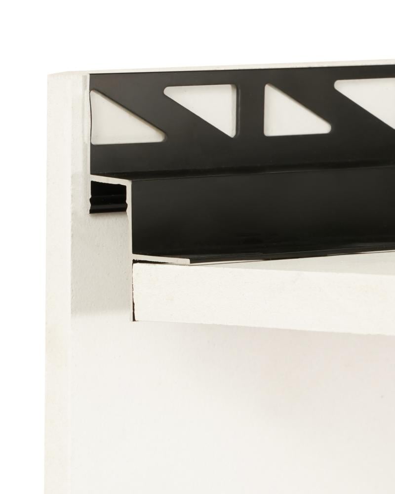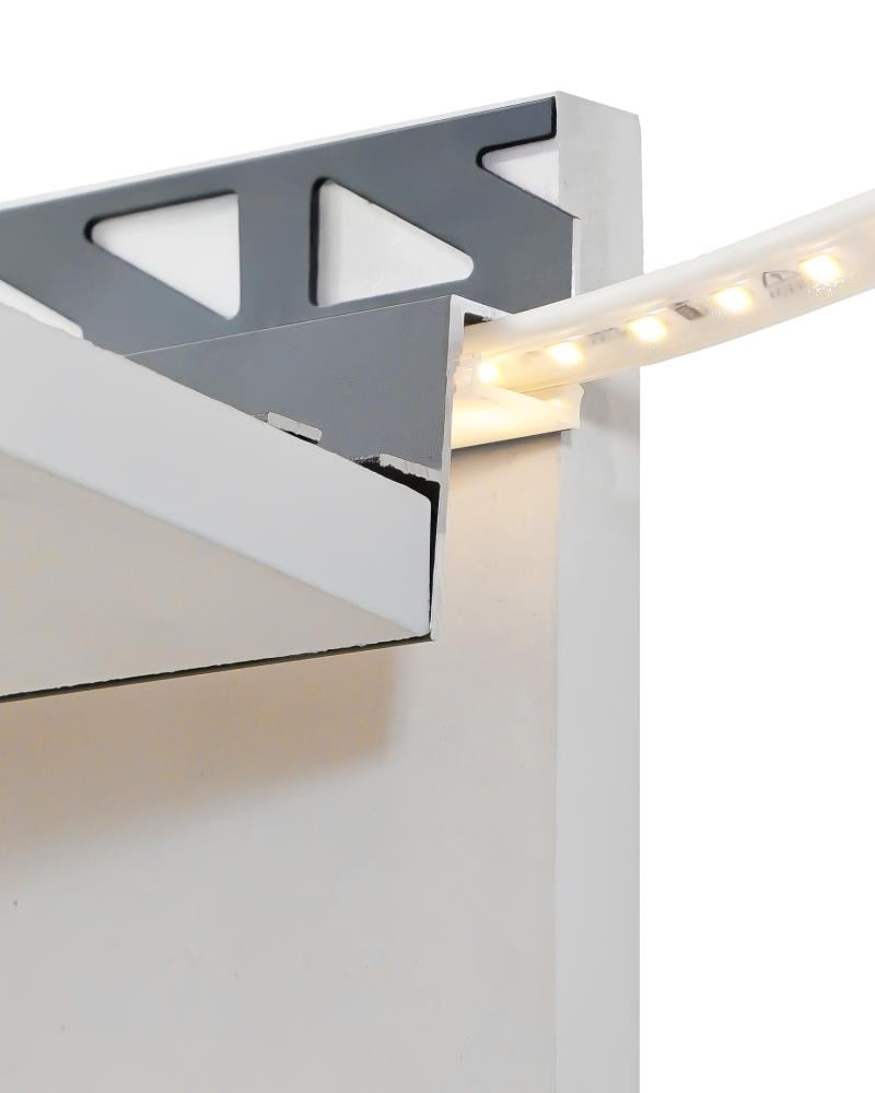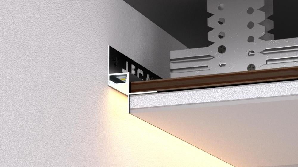 مع وجود مجرى لتركيب اضاءة الستريب لايت و غطاء مصنوع من مادة الPVC لضمان توزيع الإنارة على الجدار